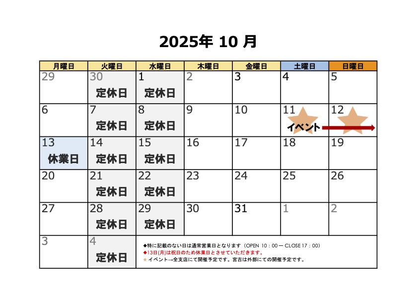 ★10/13(月)は、祝日のため休業日となります。詳しくは各支店へお問い合わせください。