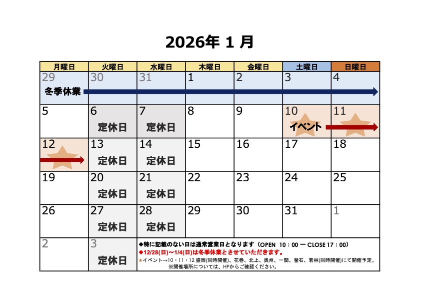 陽だまり工房ショールーム 2026年1月の営業カレンダーは以下の通りです。