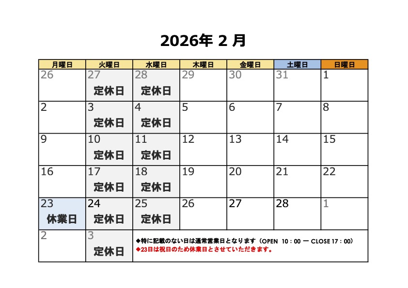陽だまり工房ショールーム 2026年2月の営業カレンダーは以下の通りです。