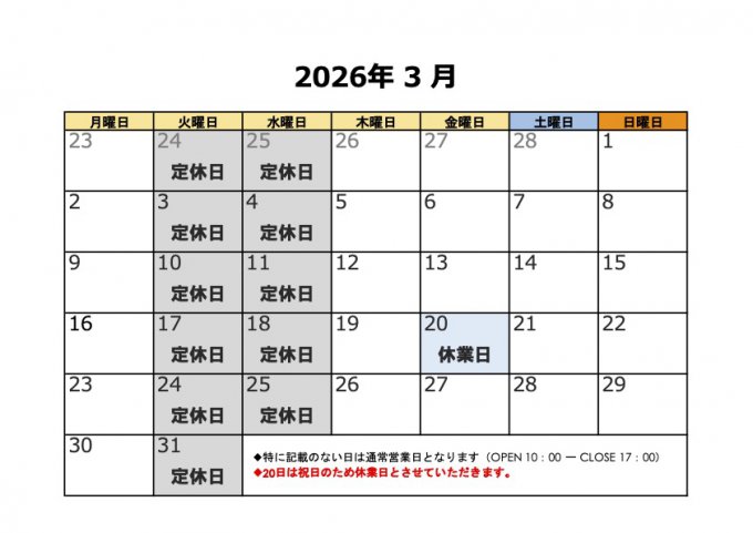 陽だまり工房ショールーム 2026年3月の営業カレンダーは以下の通りです。