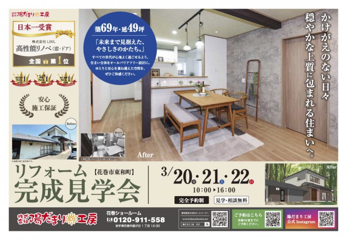 「リフォーム完成見学会 in 花巻市東和町」では、実際に陽だまり工房でリフォームしたお家を見学することができます。築69年のご自宅は家族みんなが心地よく過ごせるように、オールバリアフリー設計のお住まいへと生まれ変わりました。見学しながら様々なリフォームの相談をすることも可能です。中古住宅のリフォームを検討している方、新築かリフォームか迷われている方などにおすすめの見学会です。参加にはご予約が必須ですので、3日前までのご連絡をお願いいたします。会場の住所はチラシ・ホームページ内では公開しておりません。ご予約時にスタッフよりご案内いたします。花巻市近郊にお住まいの方でリフォームに興味のある方はぜひご予約の上ご参加ください!