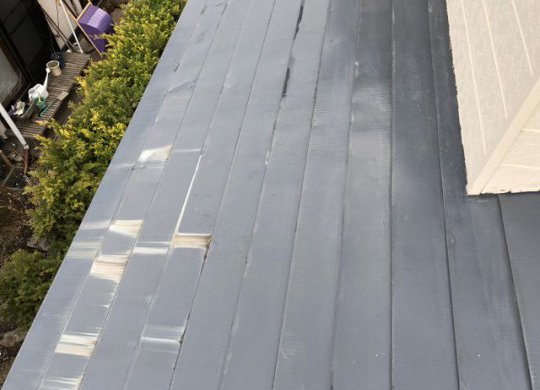 現地調査にお伺いした所、屋根のトタンの部分の塗装が剥げ、
